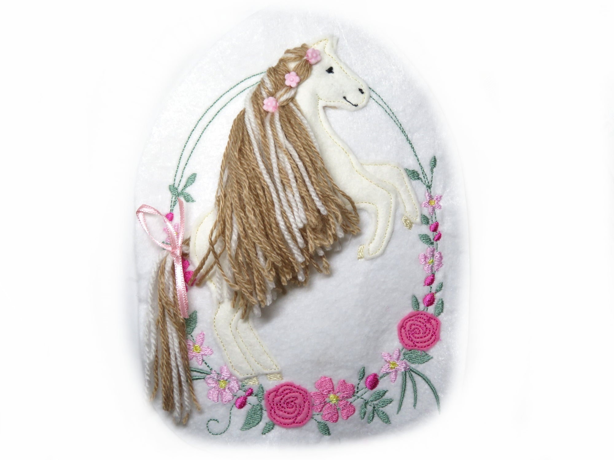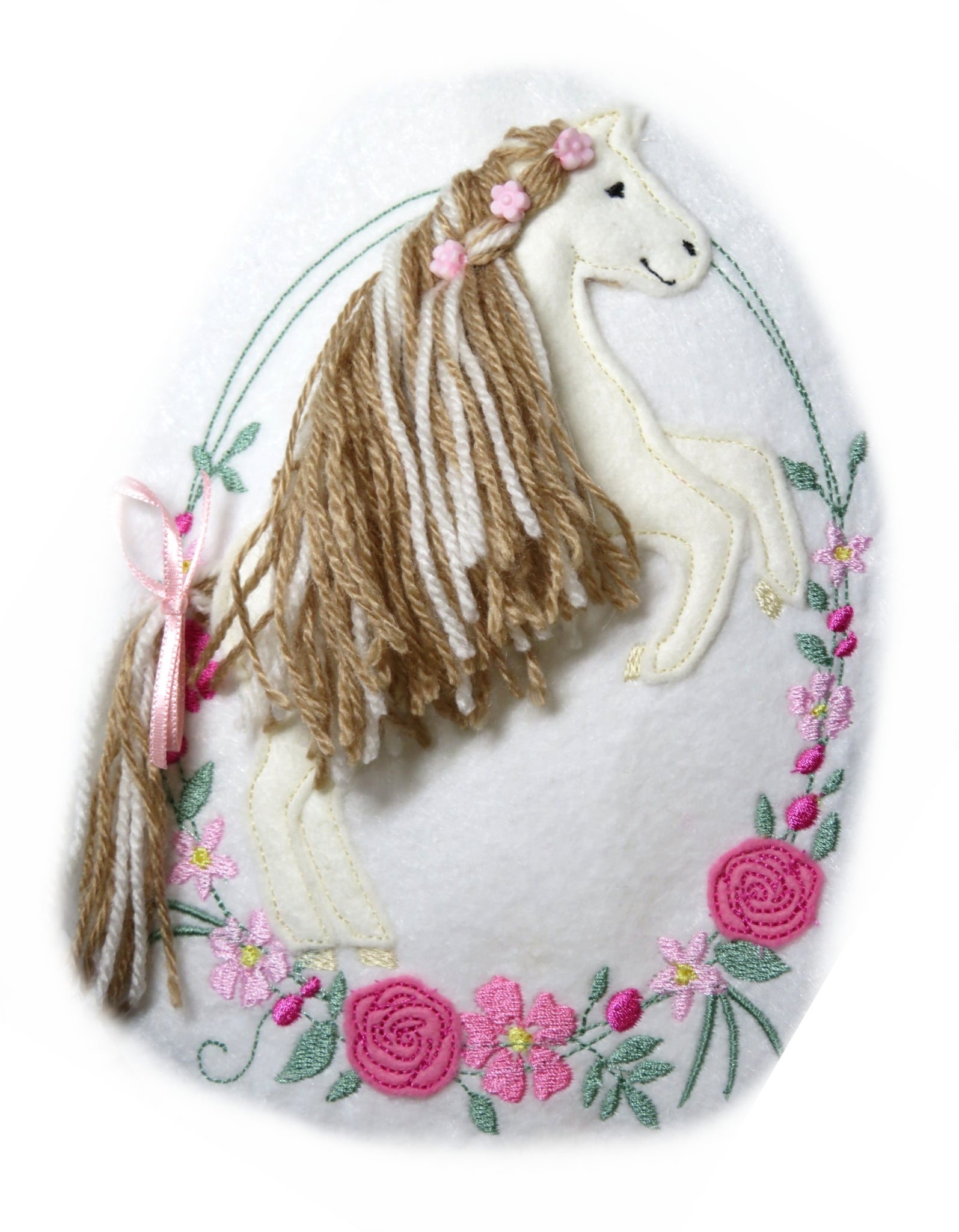 Filz Applikation - Freie Farbwahl. Ein lustiges Pferd Motif zum Aufnähen, aufkleben und dekorieren. Passt überall drauf! Sorgfältig auf Filz gestickt und mit kräftigen Farben, dieses Pferd oder Pony fällt bestimmt auf. Mit langer Mähne die man richtig flechten kann. Mit Namensschild und Blumen.